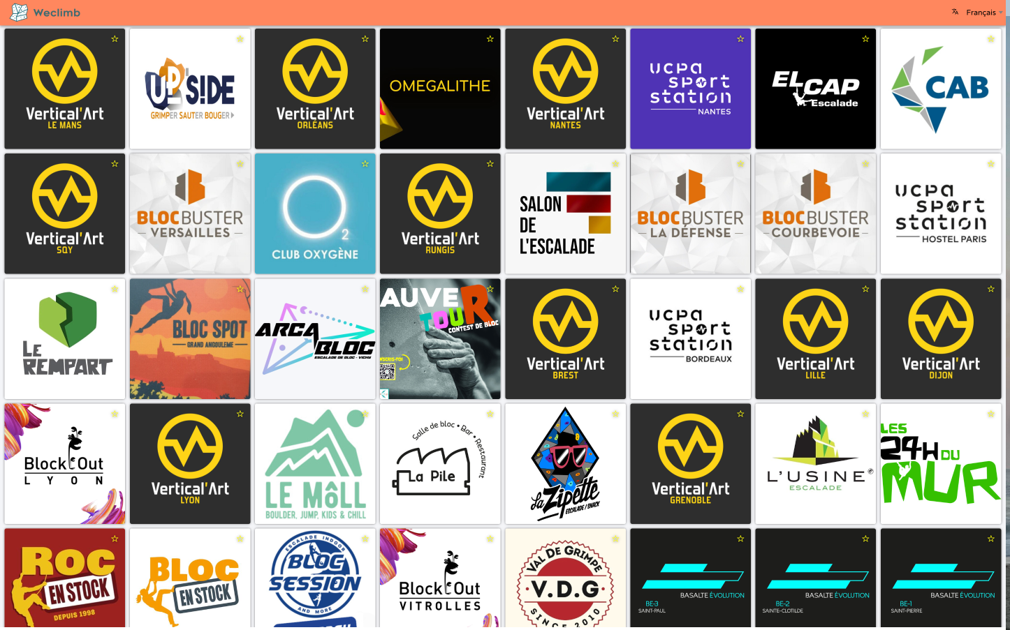 Arca Bloc BE-1 Saint-PierreBE-2 Saint-DenisBE-3 Saint Paul Bloc Session Haguenau Bloc Spot Bloc en Stock Blocbuster Courbevoie Blocbuster La Défense Blocbuster Versailles Block'Out Lyon Block'Out Vitrolles Chartres à Bloc Club Oxygène ElCap L'Usine Escalade La Zipette Lapile Le Môll Le Rempart Omegalithe Roc en Stock UCPA Bordeaux UCPA Nantes UCPA Paris UP'SIDE Vertical'Art Brest Vertical'Art Dijon Vertical'Art Grenoble Vertical'Art Le Mans Vertical'Art Lille Vertical'Art Lyon Vertical'Art Nantes Vertical'Art Orléans Vertical'Art Rungis Vertical'Art SQY